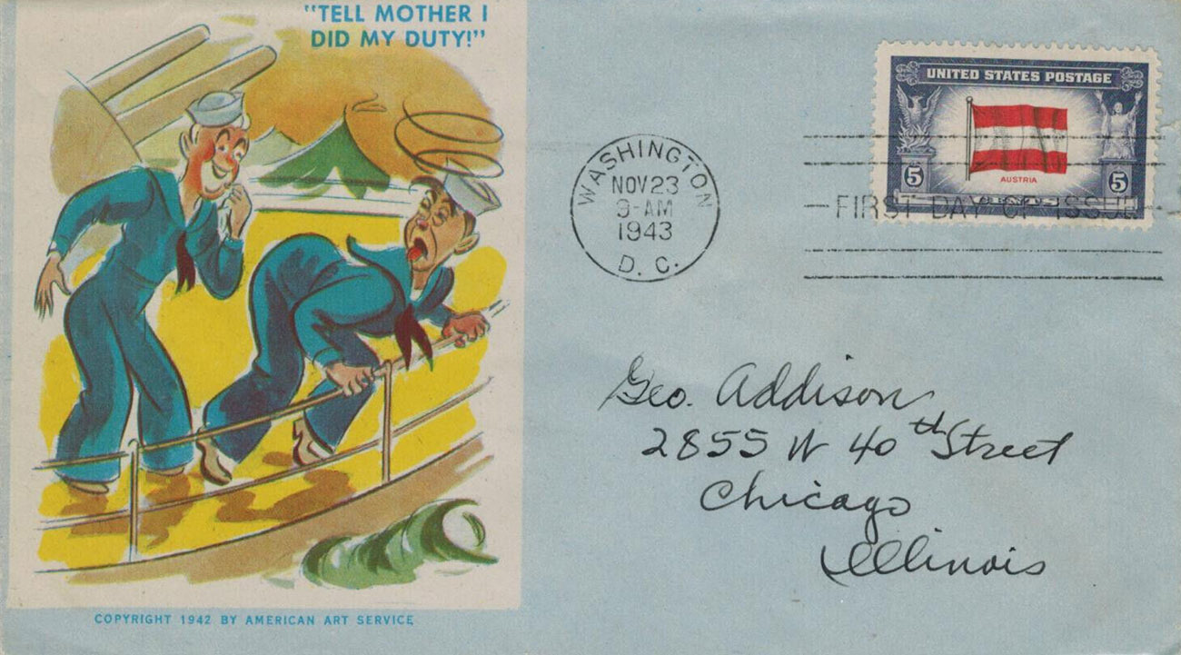 This page displays World War II Patriotic cachets published in 1942 by the American Art Service (AAS) of Chicago, Illinois. The artist for all these designs is unknown. I have seen only a few 1941-1945 canceled covers serviced as