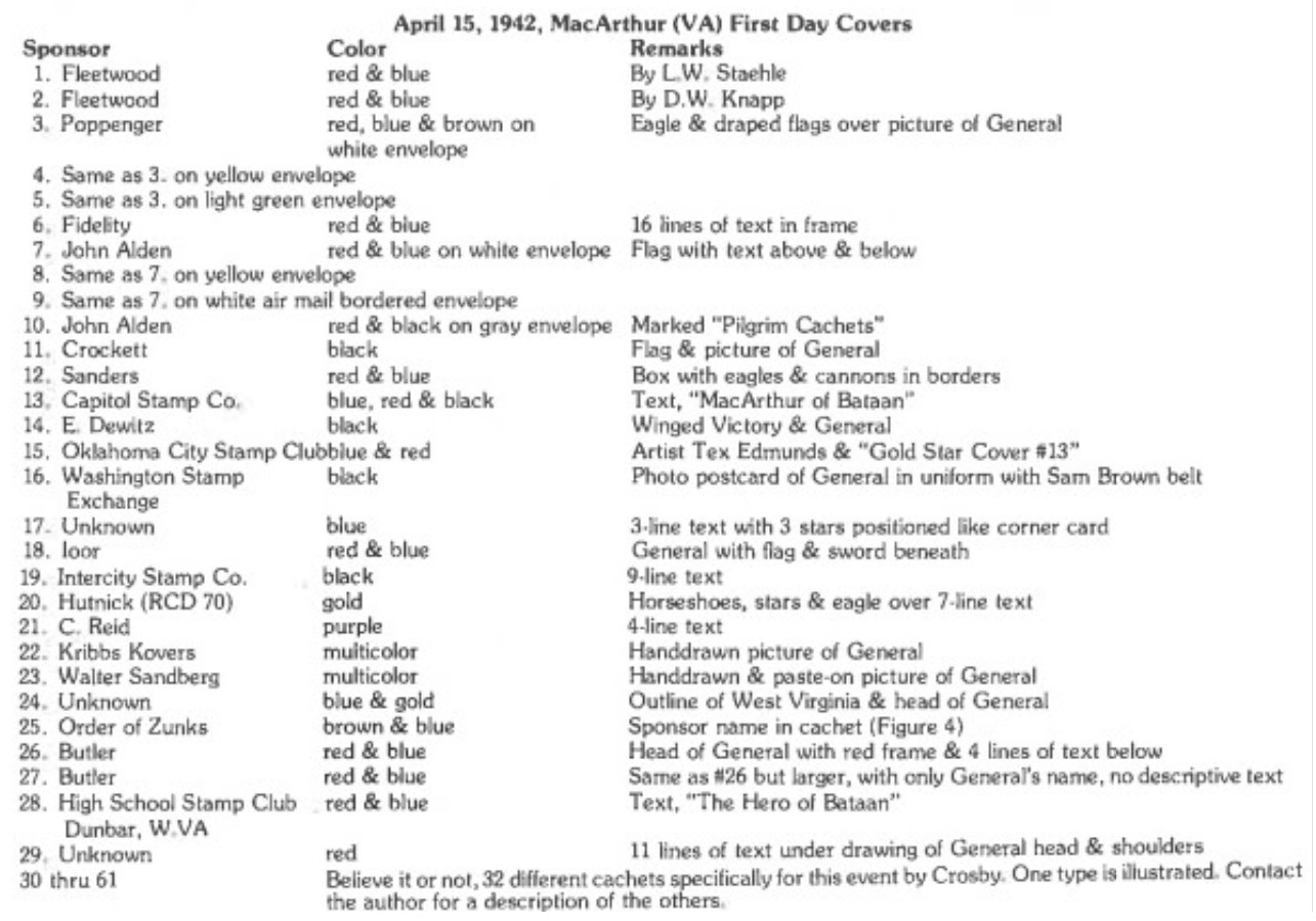 This page is indebted to the late M. Douglas Parks, the only collector I know of who published a detailed list of these cachets. His 1986 article with his table list: "April 15, 1942, MacArthur (VA) First Day Covers" provided the initial format of this page and his assigned numbers are used here.