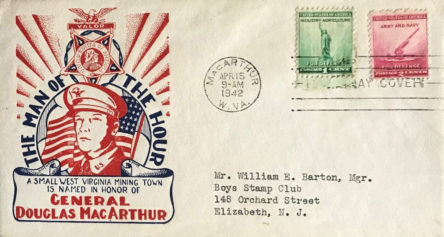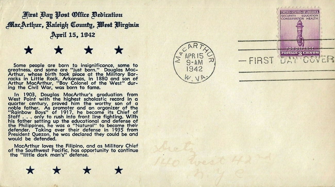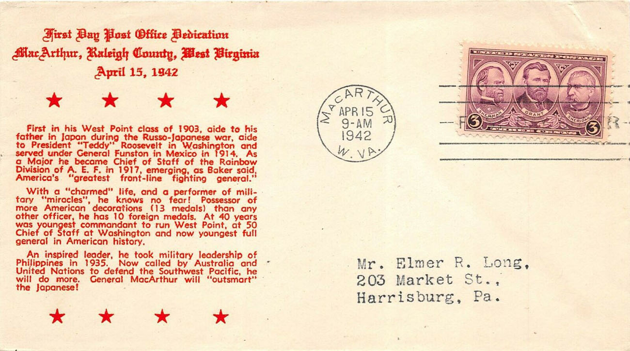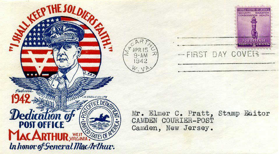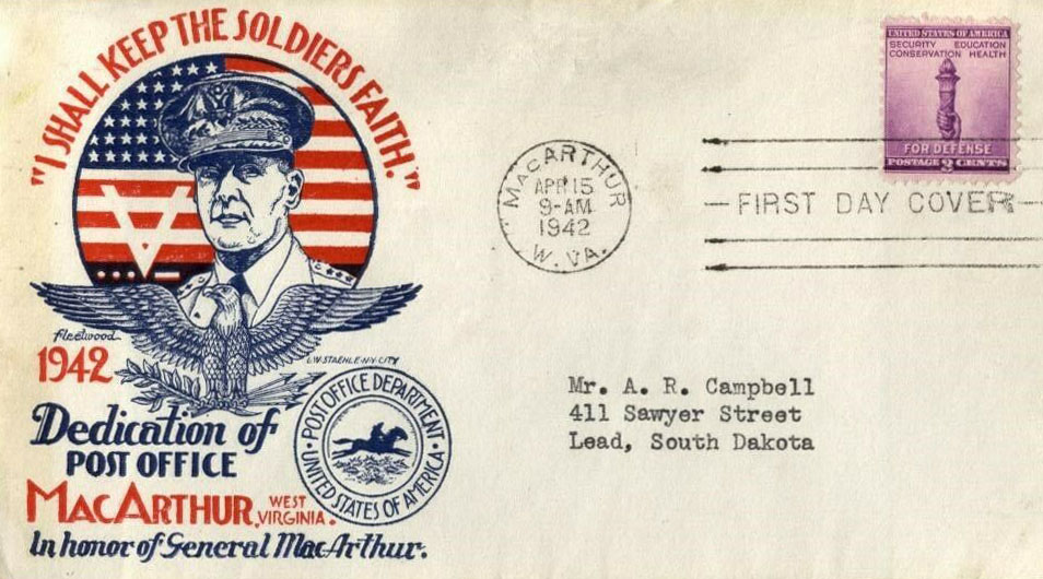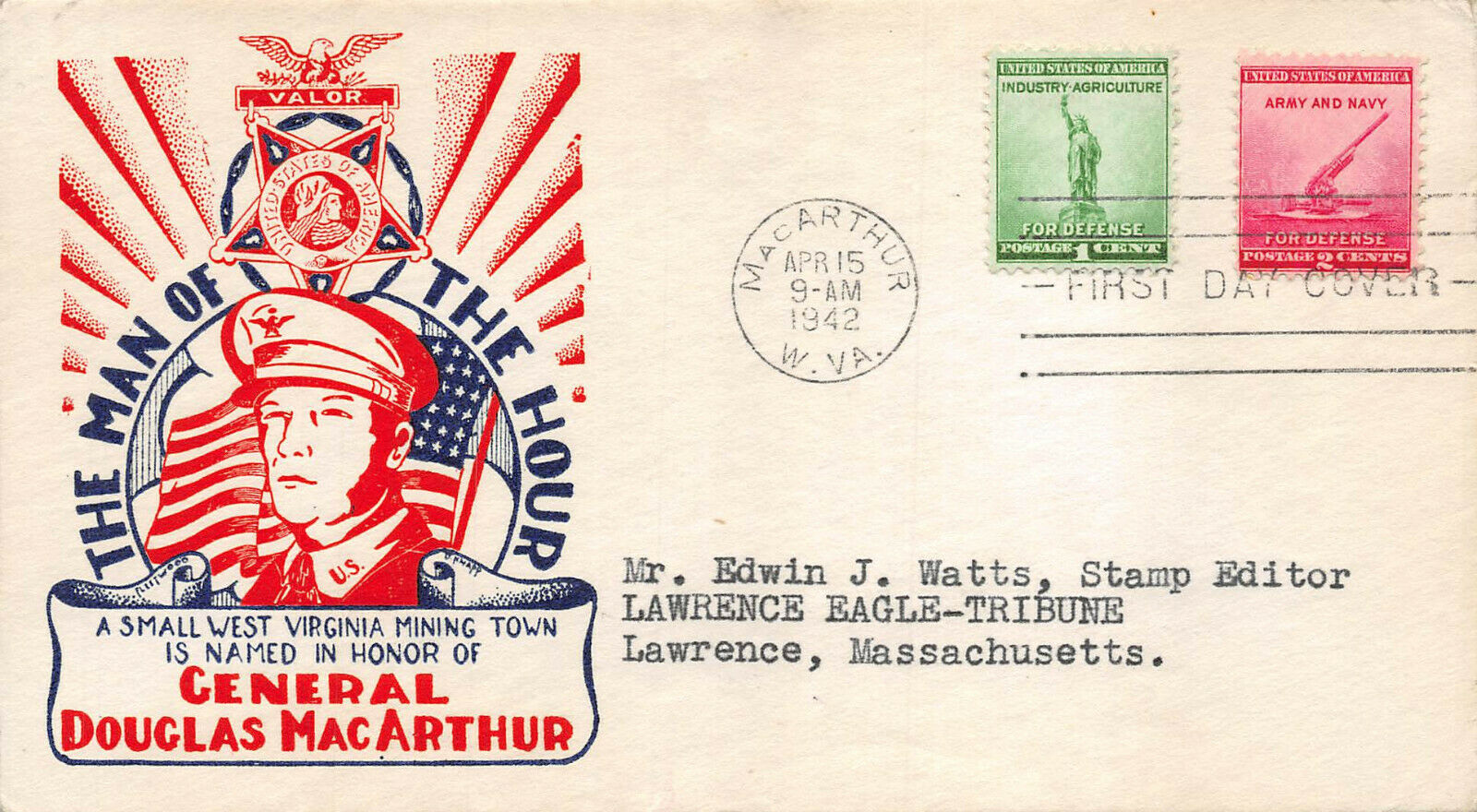 "April 15, 1942, MacArthur (VA) First Day Covers" [Sic (WV), Post Office Dedication]