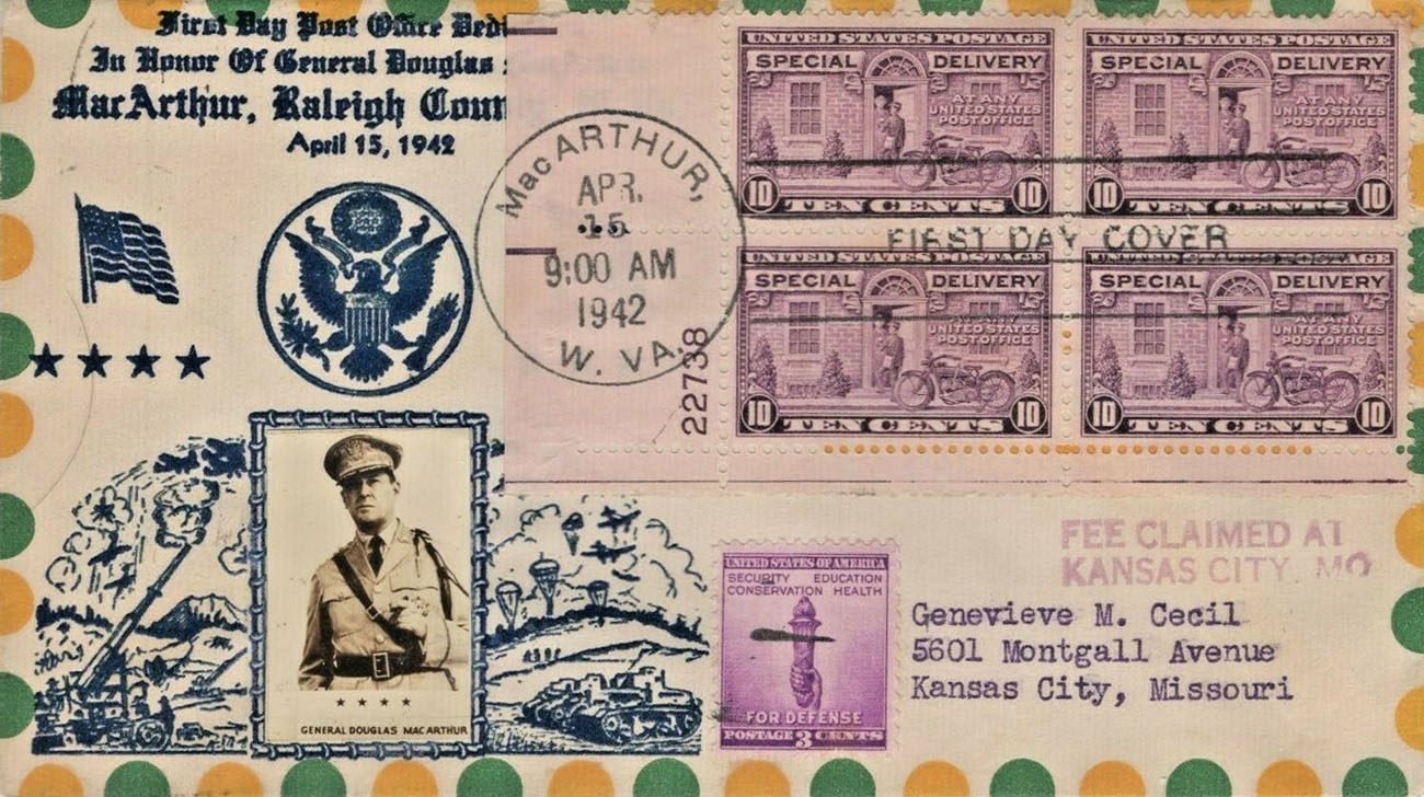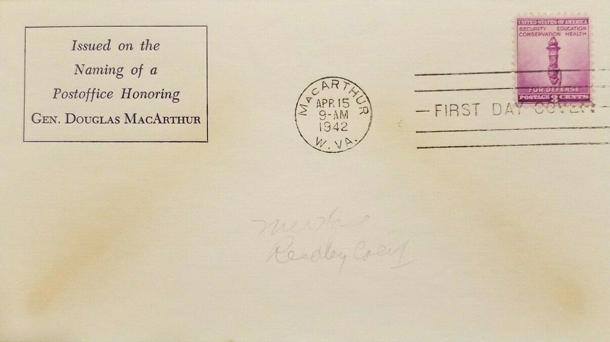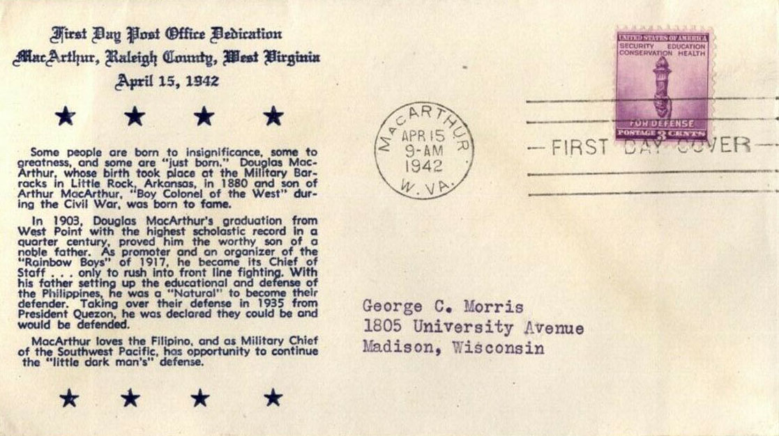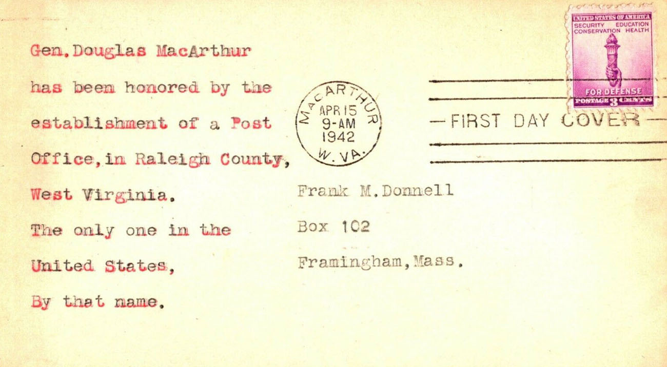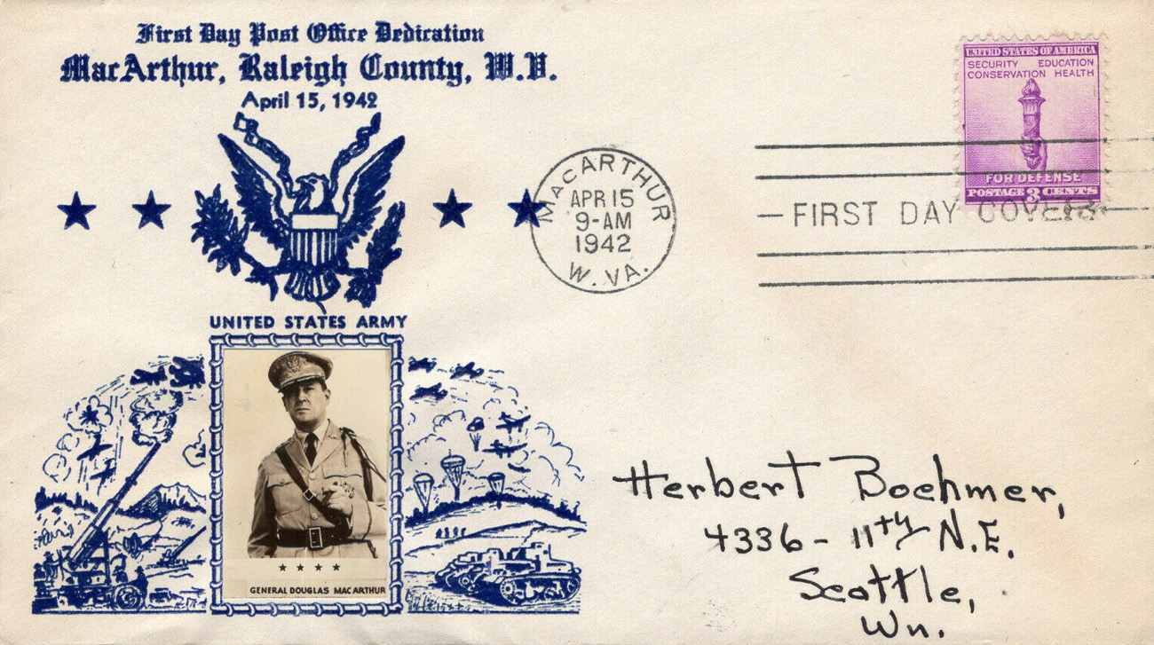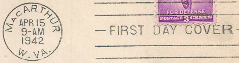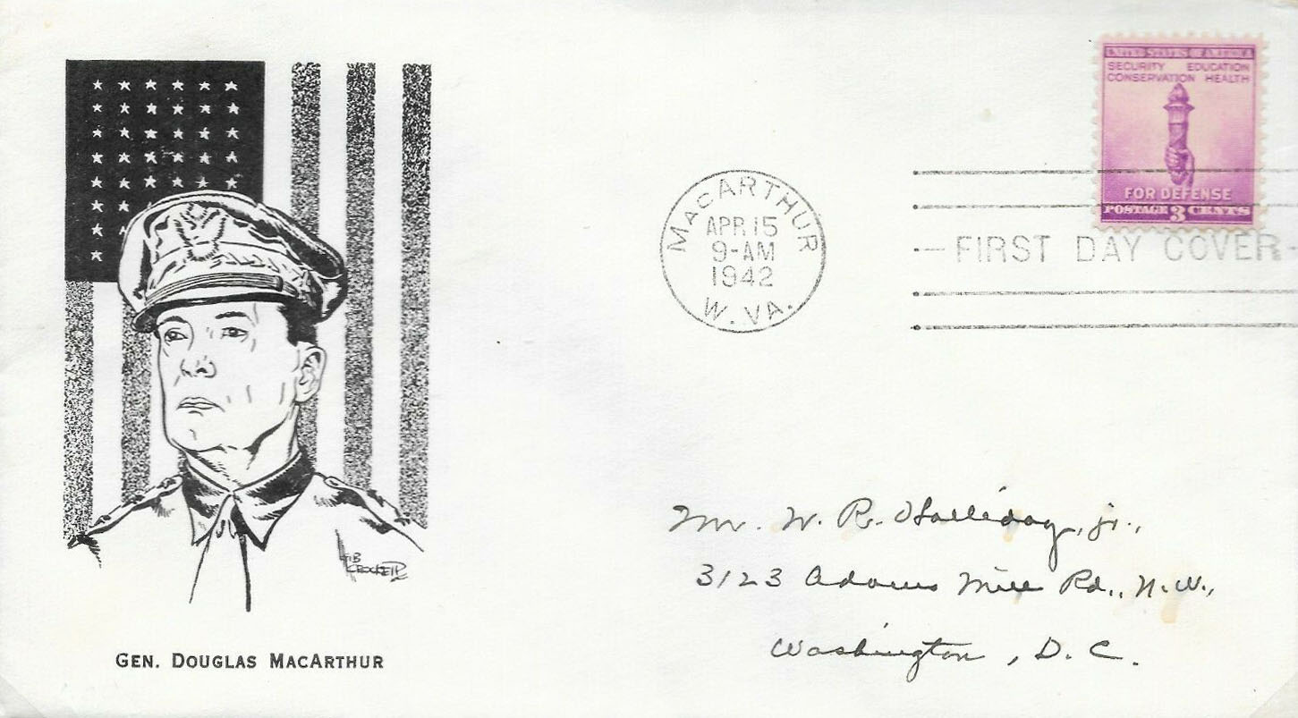 "April 15, 1942, MacArthur (VA) First Day Covers" [Sic (WV), Post Office Dedication]