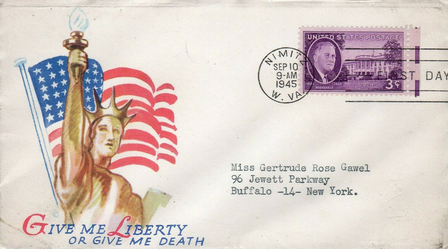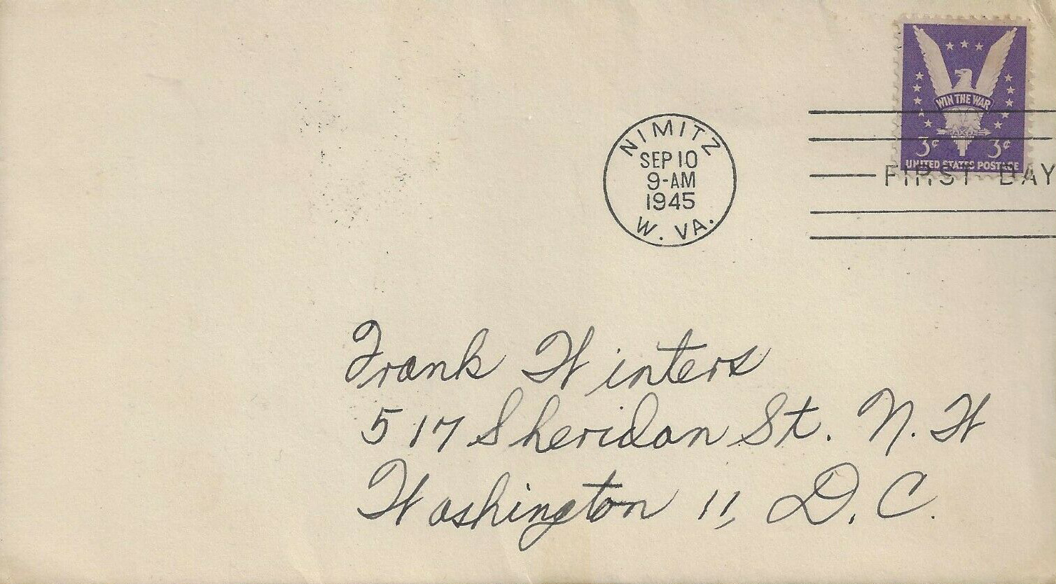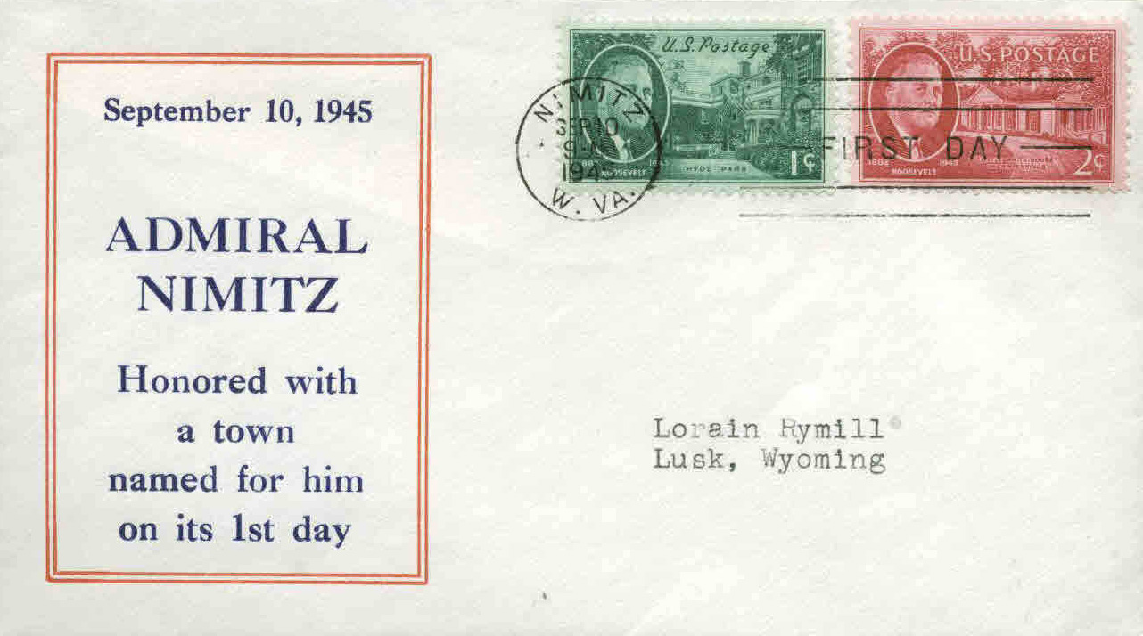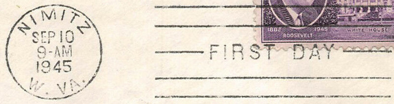 of any United States postage stamp. These cancels and the covers displayed here document the renaming and naming of two West Virginia towns during and just after World War II and the new Post Office dedication events that occurred there. The wording within the cancel bars of these covers was never used either before or after these dates for any other purpose by the USPOD or the USPS. I am displaying these covers here because they are often mistaken for "First day of issue" First Day Covers (FDC) due to the misleading wording in the cancels.