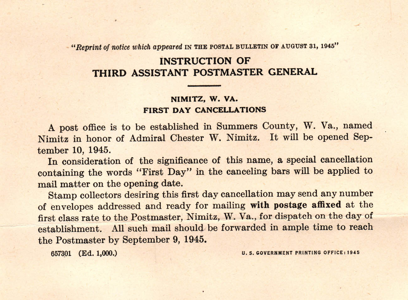 MacArthur, WV and Nimitz, WV Post Office Dedications