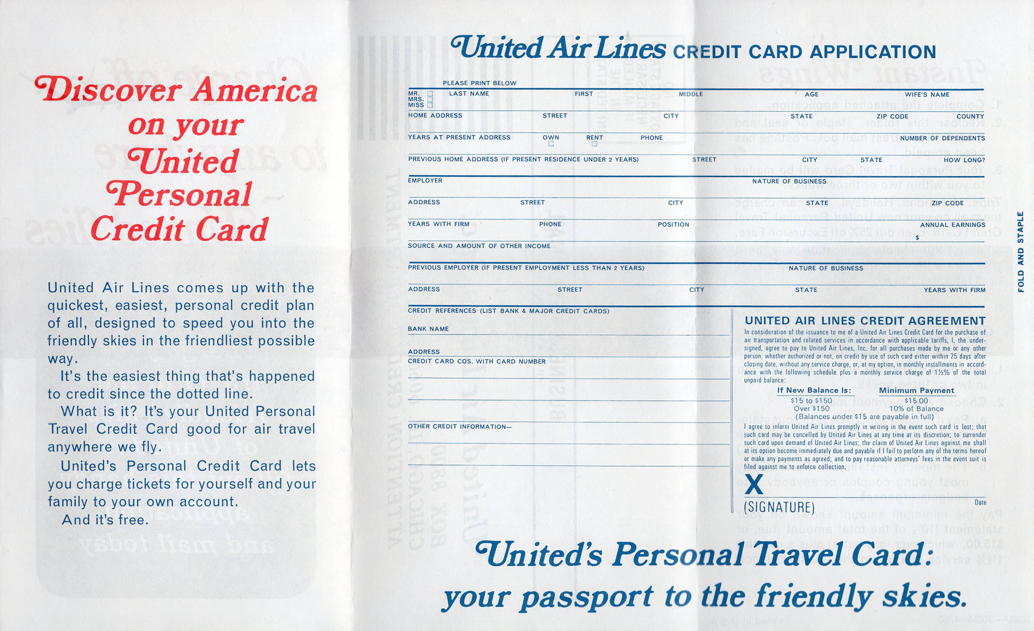 United Air Lines addressed envelope and matcvhing letter with tri-fold United Air Lines Credit Card application