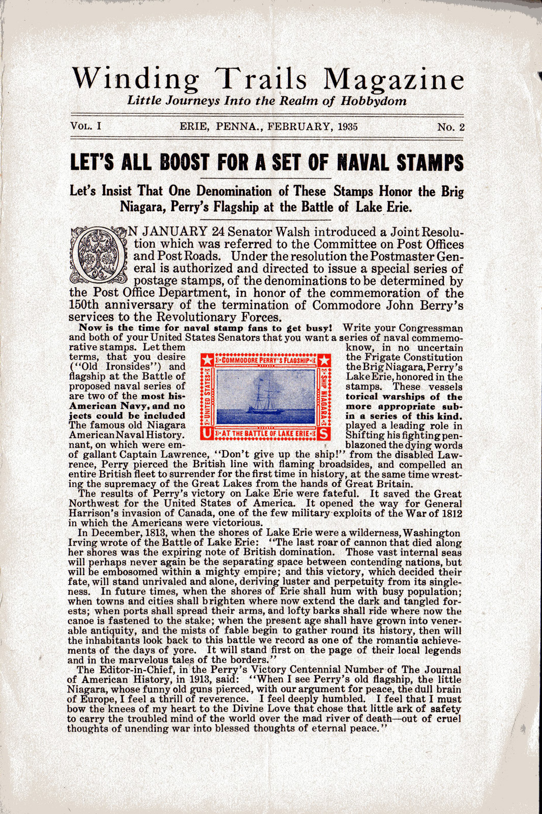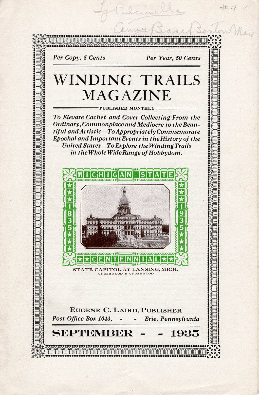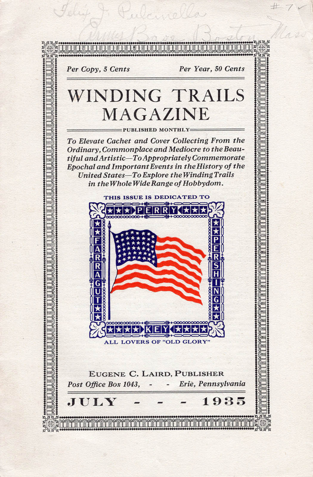 Winding Trails Magazine (WTM) was published in Erie, PA by Clarence E. Laird, Historian (1861-1937) and Eugene C. Laird, Cachetmaker (1896-1980). Information is now known about all, except two, of the 24 published issues of this 1935-1937 First Day Cover (FDC), Naval cover, and other Special Event cover Cachetmaking, Stamp collecting, and Coin collecting periodical.