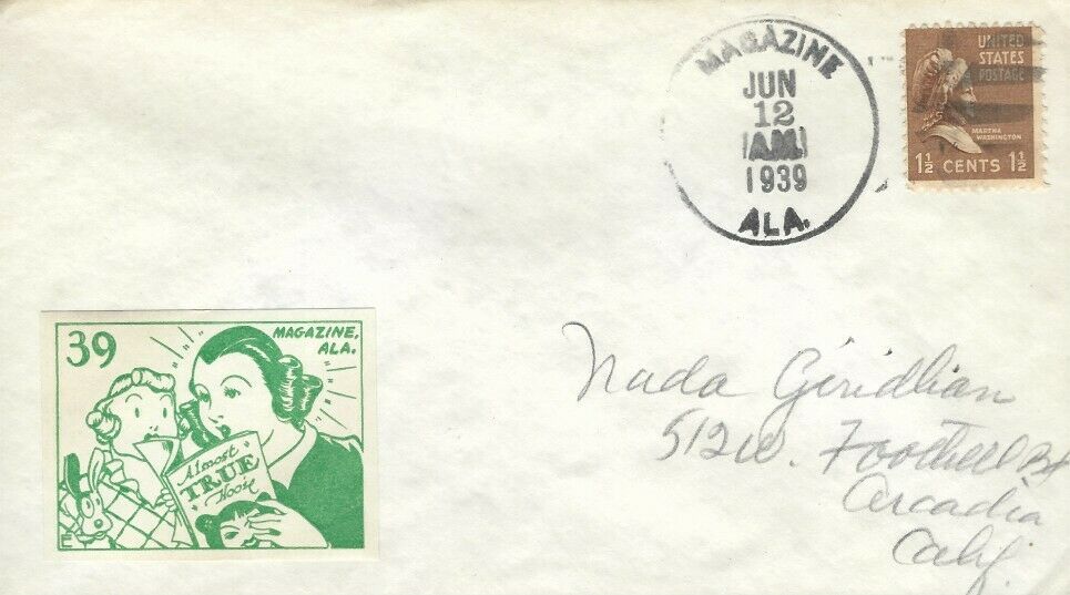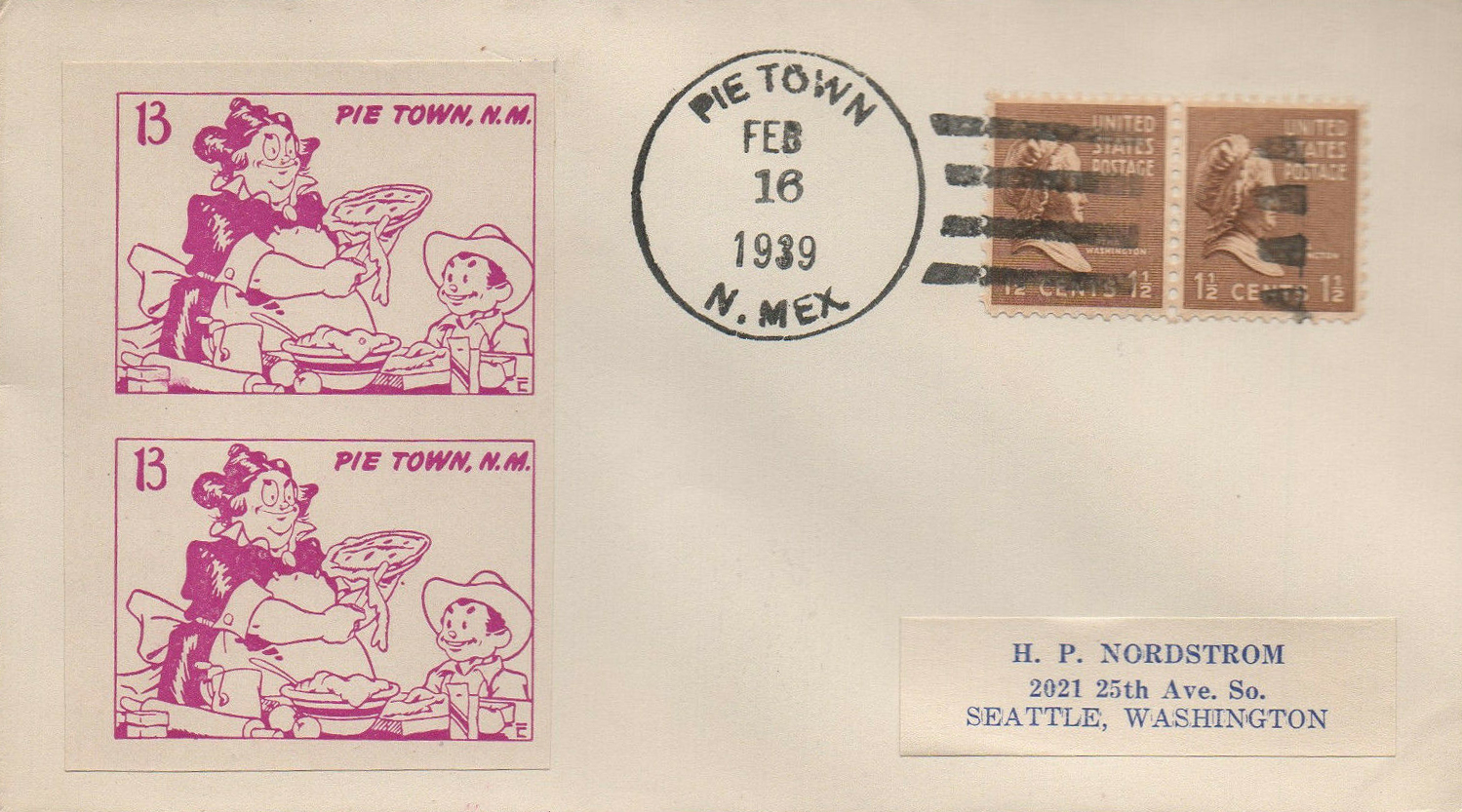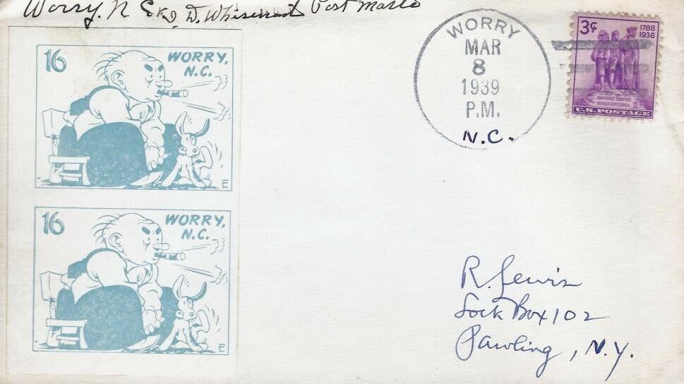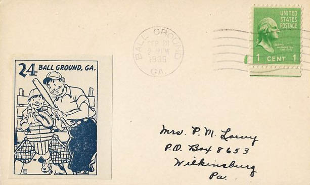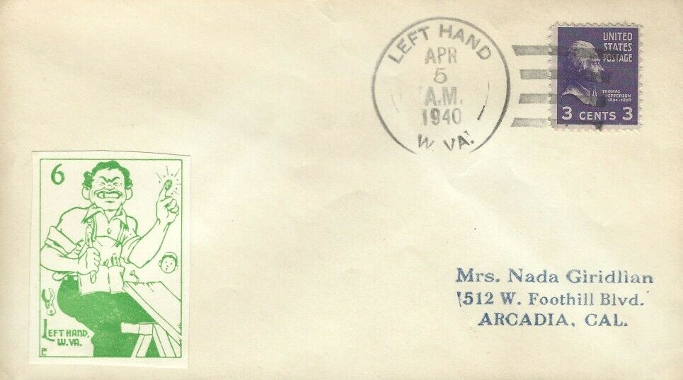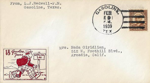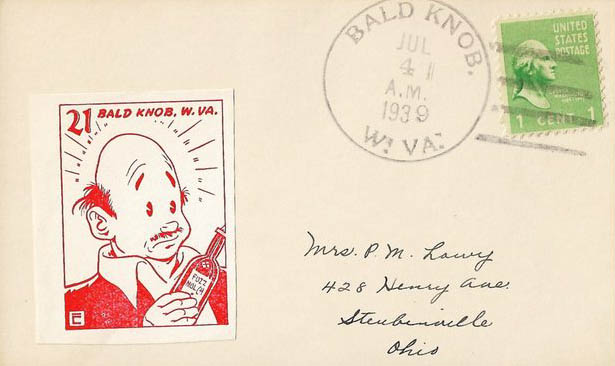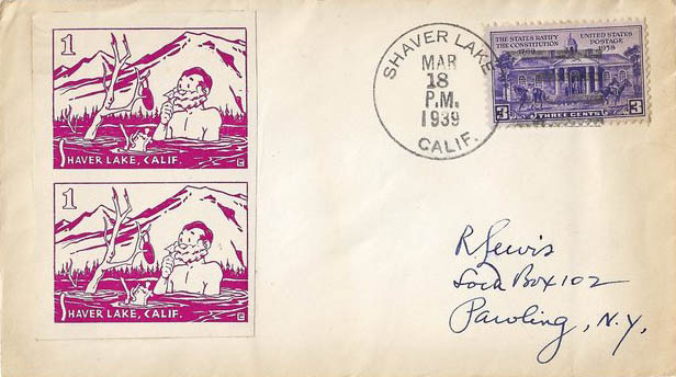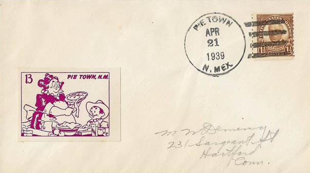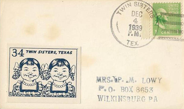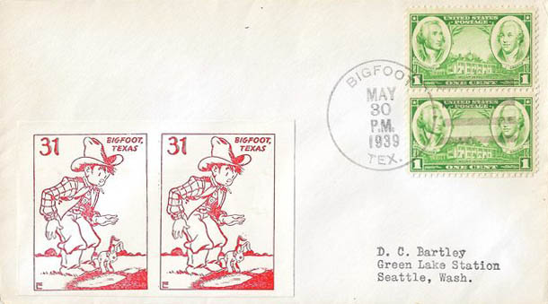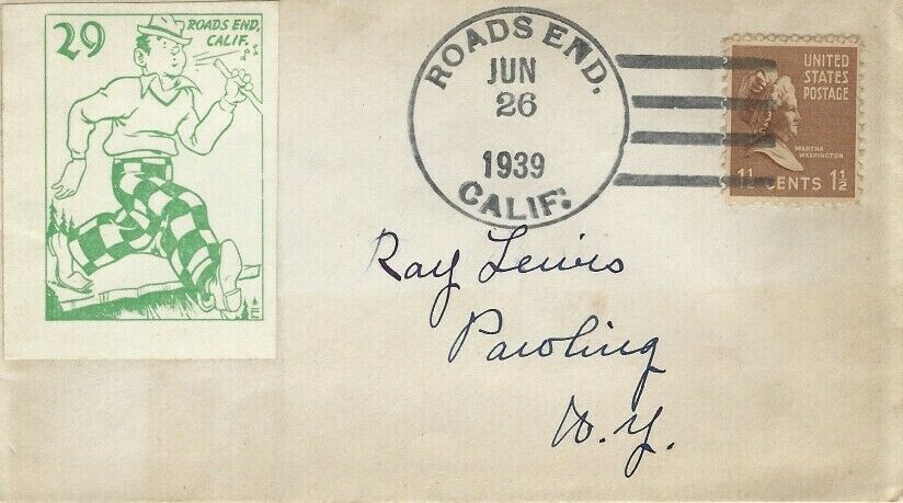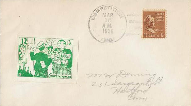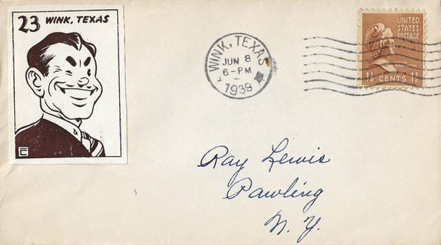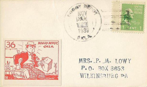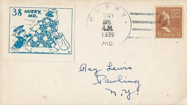 This page displays Poster Stamps (aka Cinderellas or labels) depicting cartoons about U.S. cities with unusual names, created between 11-26-1938 and 4-05-1940 by John Coulthard of Modesto, CA, and the covers that were serviced in each city with these stamps. These stamps were sold in imperforate blocks of four in the Western Stamp Collector newspaper in 1938-1940. It is unknown which covers, if any, were serviced by Coulthard. None of the covers displayed here are addressed to him. Other reported covers have been canceled as late as 1951.