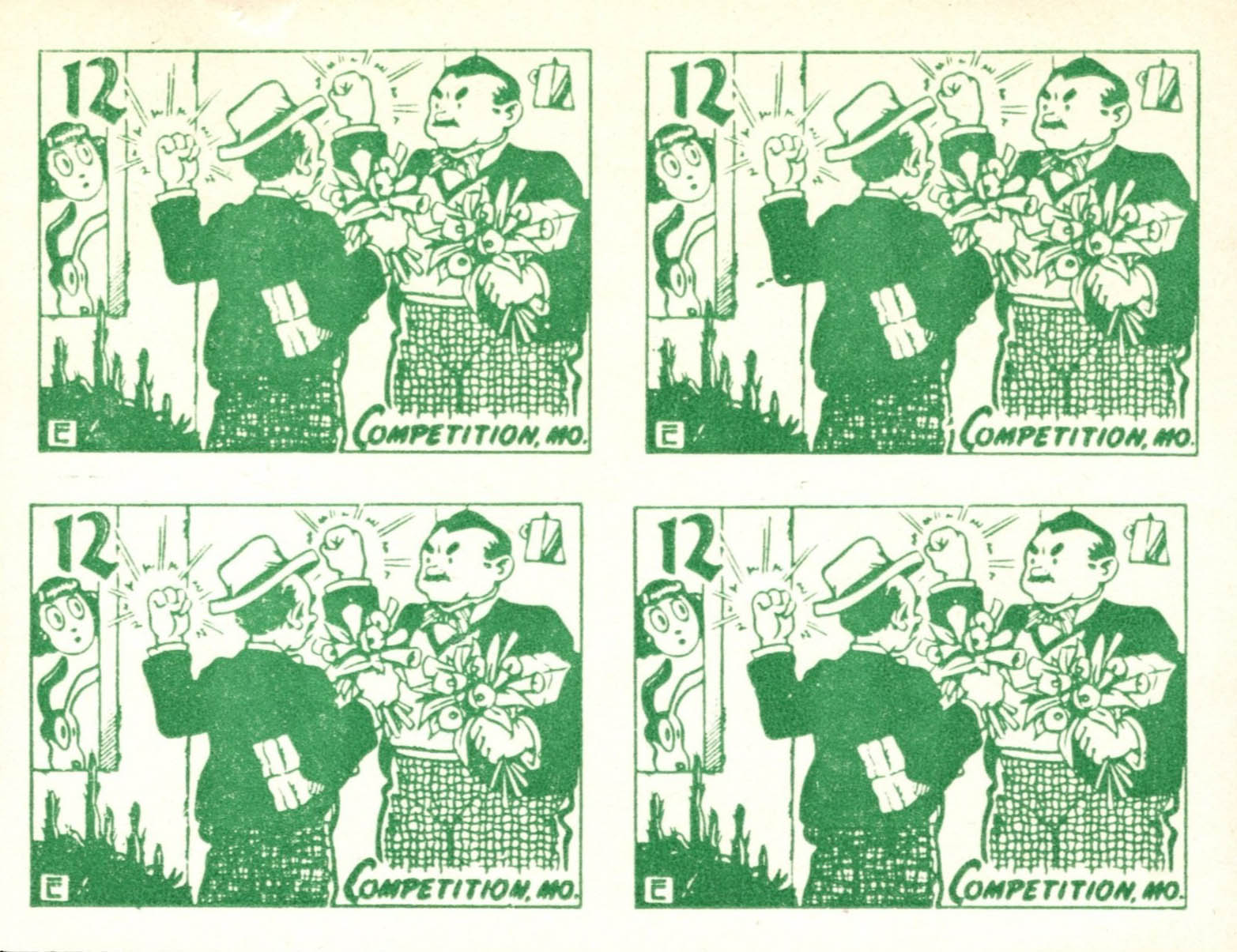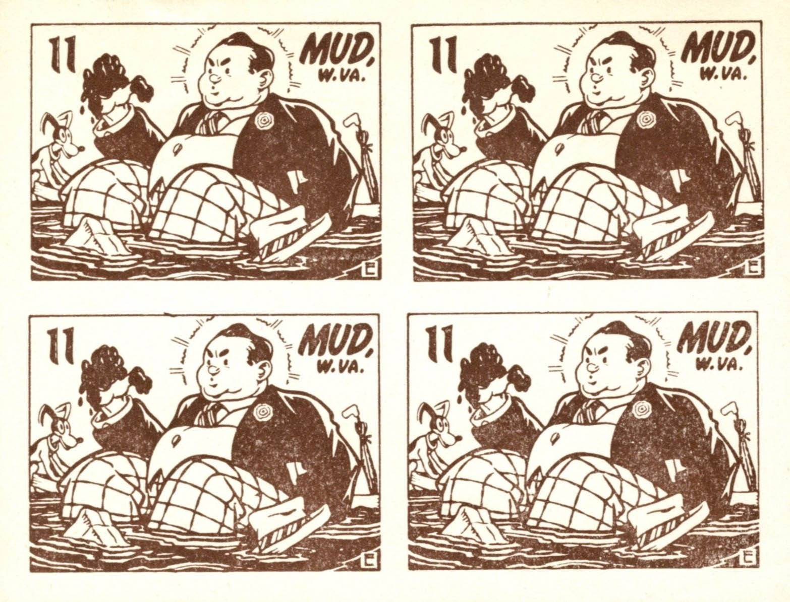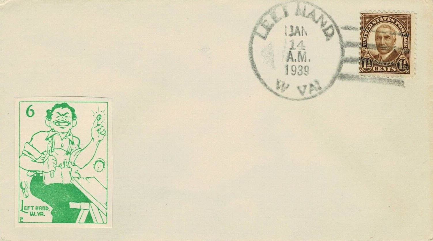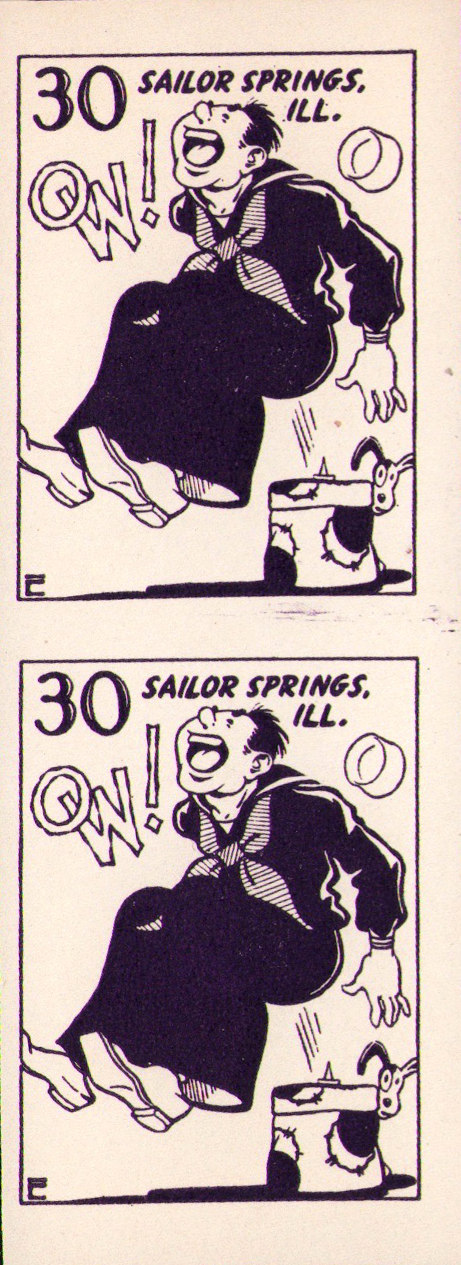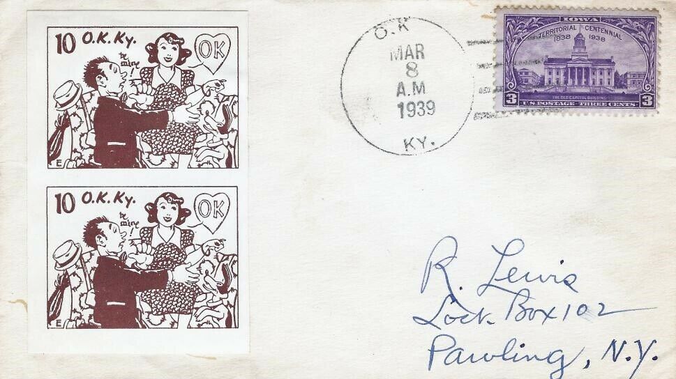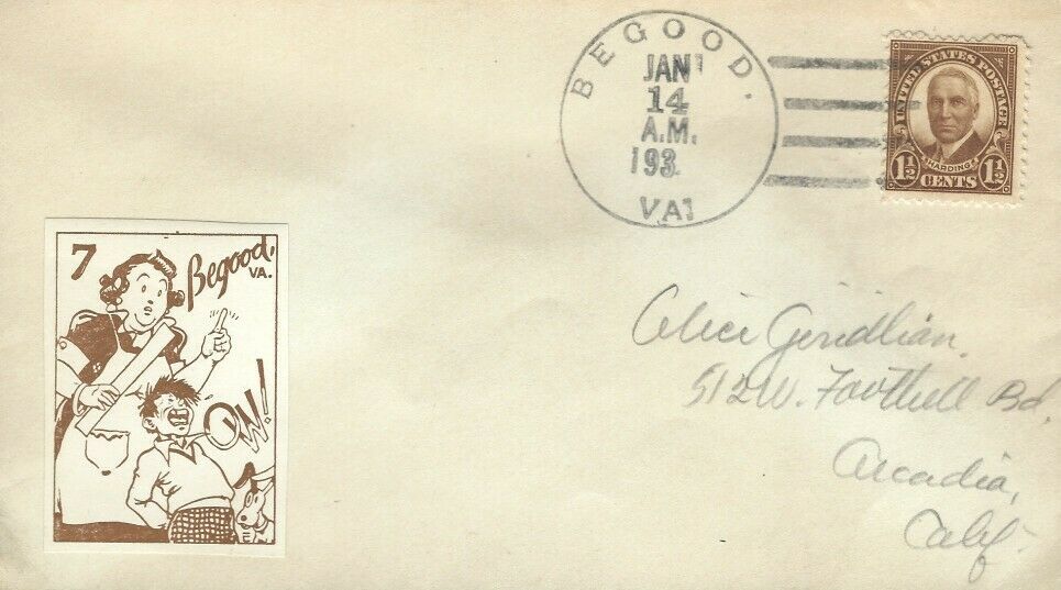 This page displays Poster Stamps (aka Cinderellas or labels) depicting cartoons about U.S. cities with unusual names, created between 11-26-1938 and 4-05-1940 by John Coulthard of Modesto, CA, and the covers that were serviced in each city with these stamps. These stamps were sold in imperforate blocks of four in the Western Stamp Collector newspaper in 1938-1940. It is unknown which covers, if any, were serviced by Coulthard. None of the covers displayed here are addressed to him. Other reported covers have been canceled as late as 1951.