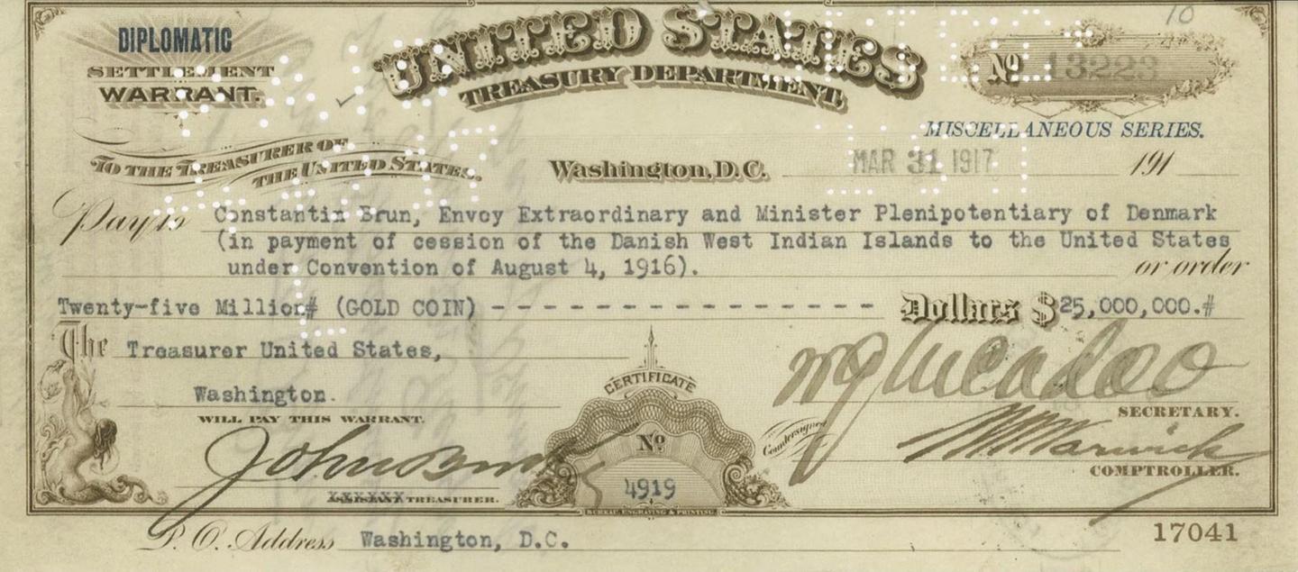 This Date in Danish American History - The US Virgin Islands, this is a photograph of the actual $25 million dollar check the United States gave to Denmark on 3-31-1917 for the purchase of the Danish West Indies, which was renamed to the United States Virgin Islands (USVI).