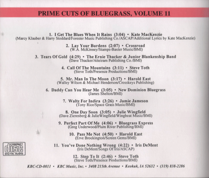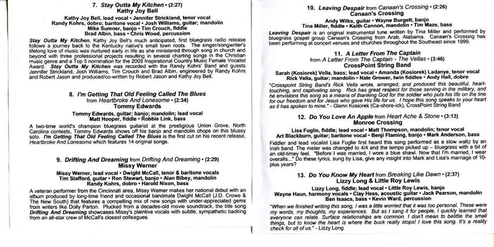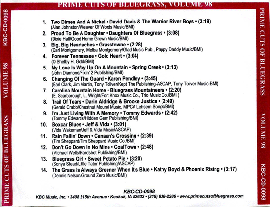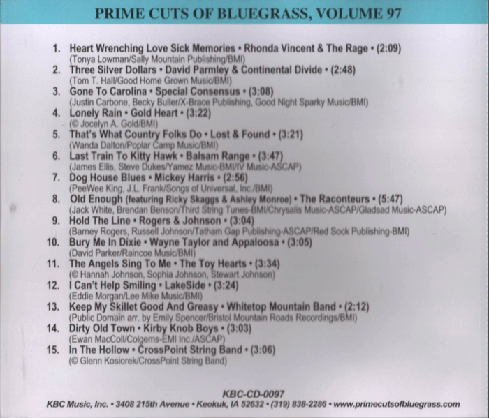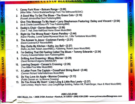 This page displays thumbnails of scanned liner note Covers, etc. of Prime Cuts of Bluegrass CD's, released by Kirk & Becky Brandenberger's KBC Music, Inc. series, Prime Cuts of Bluegrass from 1992-2009.