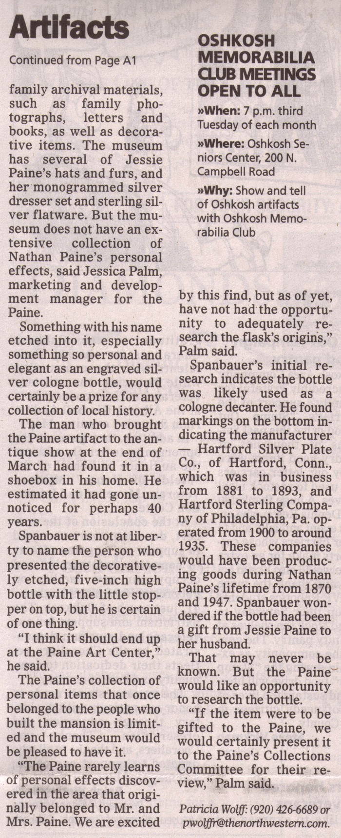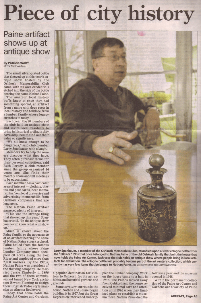 For this purpose we show our collections and have an annual program at the Senior Center allowing people to have their Oshkosh-related items assessed by memorabilia collectors or by antique dealers.