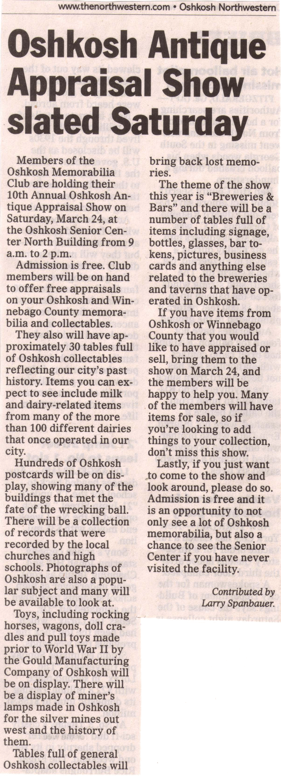 If you have Oshkosh or Winnebago County area items, bring them to the show for Appraisal.