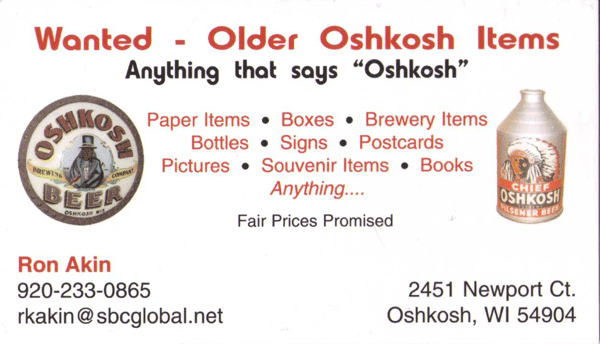 Wanted - Older Oshkosh Items Anything that says "Oshkosh" Paper Items -- Boxes -- Brewery Items Bottles -- Signs -- Postcards Pictures -- Souvenir Items -- Books Anything ... Fair Prices Promised |
