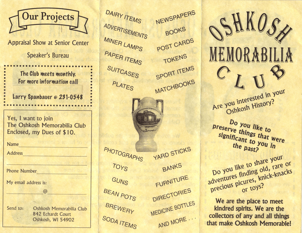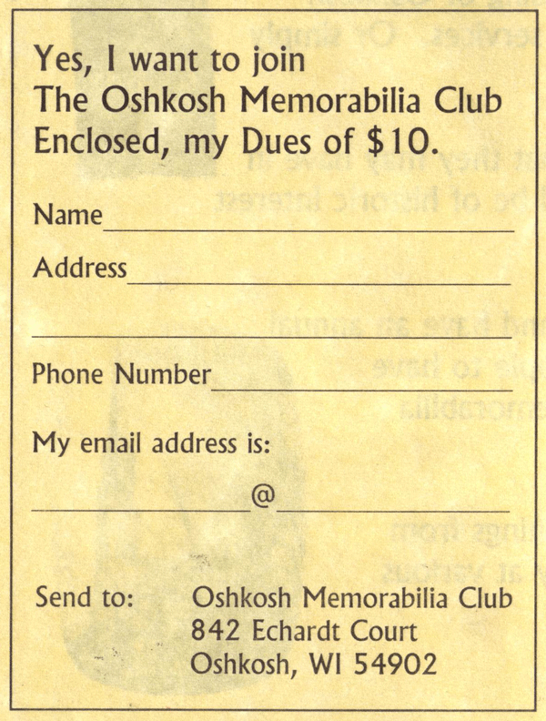 Membership is open to anyone who is interested in any facet of Oshkosh memorabilia, especially in collecting it or preserving it.