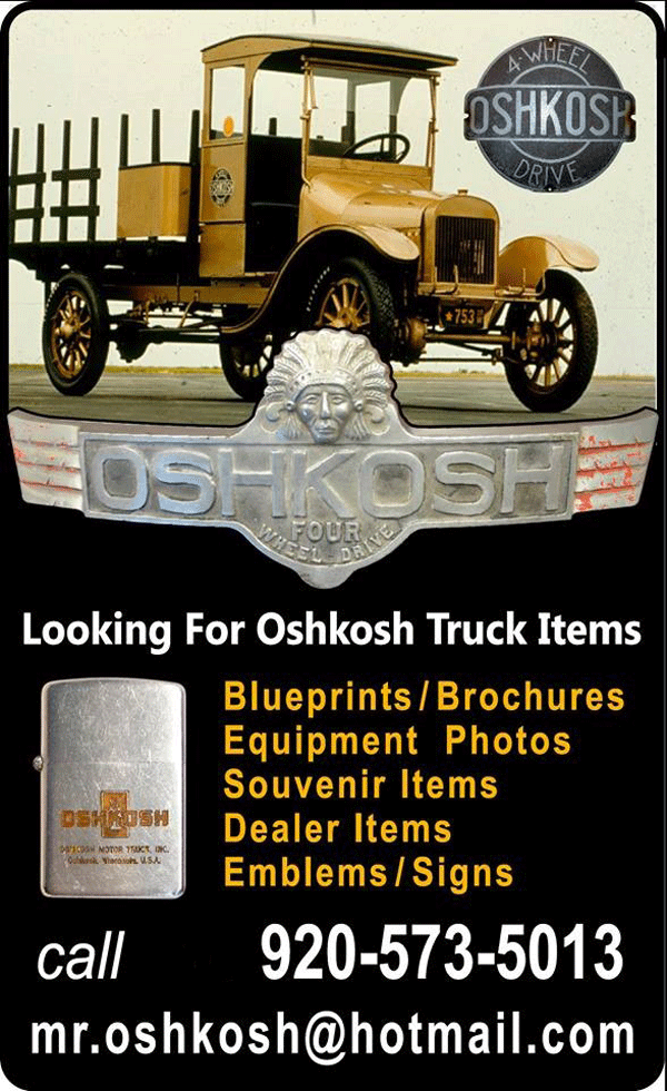 We Do Programs: Are you a program chairman looking for a speaker? We can provide a variety of subjects involving the collecting of Oshkosh memorabilia. Contact Larry Spanbauer